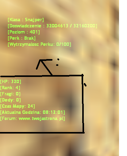Chciałbym aby nie było tam napisu "Zapraszamy na www.twojastrona.pl a wszystko Od napisu HP do napisu Forum znalazło się pod zielonym Hud`em oraz aby był zmieniony kolor tego białego hud na zielony oraz miał kwadratowe nawiasy ![]()