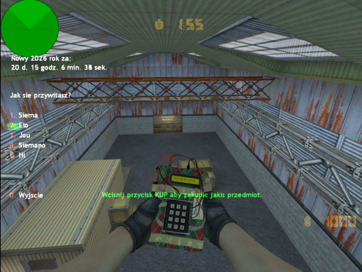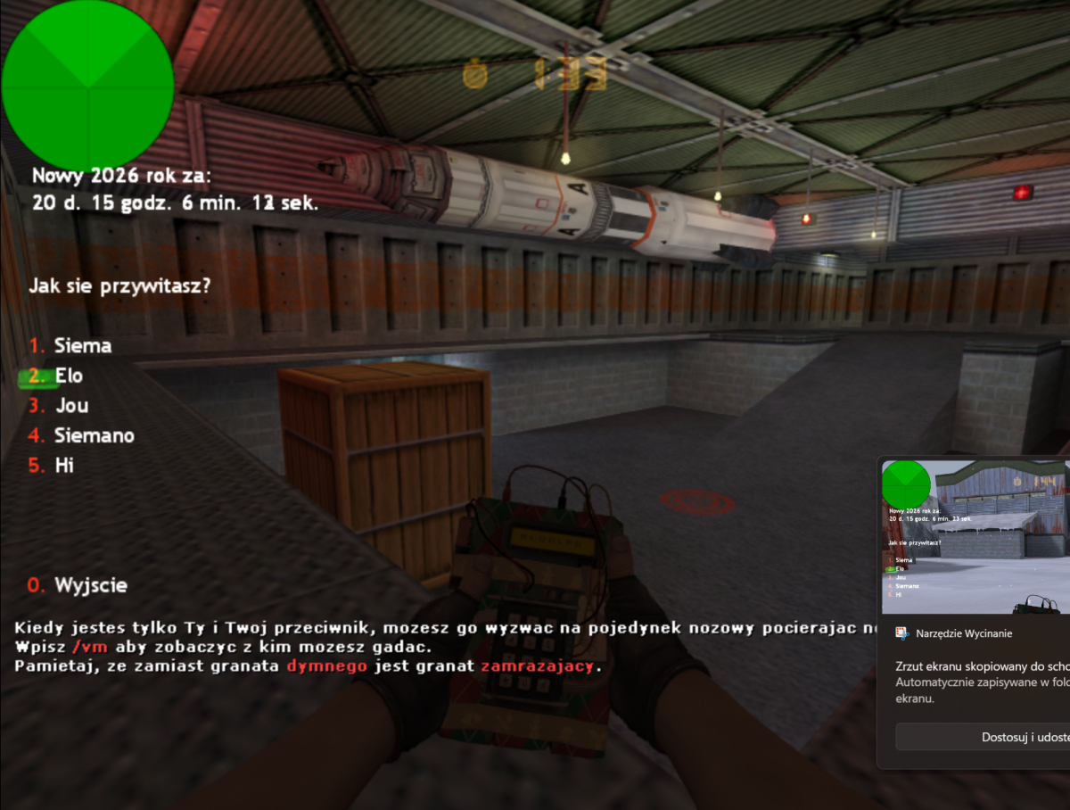 Respawnuje w różnych miejscach na mapie w powietrzu. Wybór przywitania czasem nie pojawia się na say. Kolory póki co najmniej istotne ale dobrze by było aby nick był w kolorze teamu a treść w kolorze jaki ktoś sobie ustawił w con_color + odstępy.